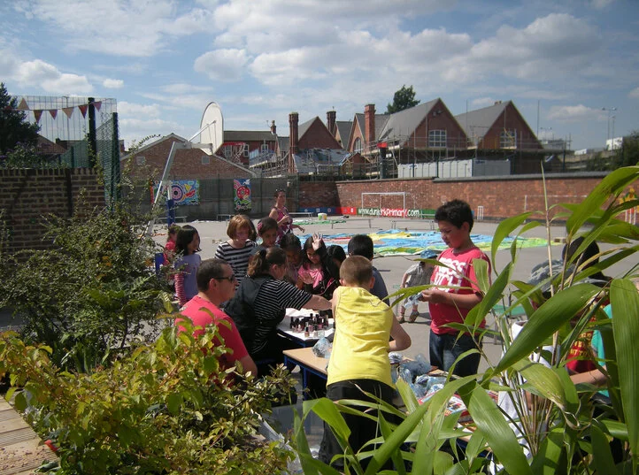 We created a huge ‘living’ tunnel with climbing plants forming the side and roof. A sound system plays birdsong. Within this space the whole school can meet for lunches and events, and parents can wait and socialise.